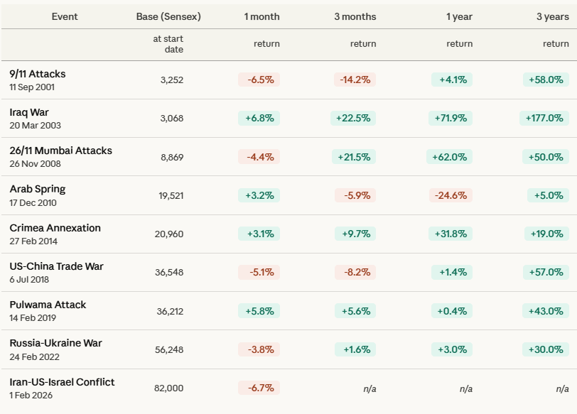 Sources: BSE India / Forecasts.org (Sensex monthly closes). Returns are price-only. * Iran-US